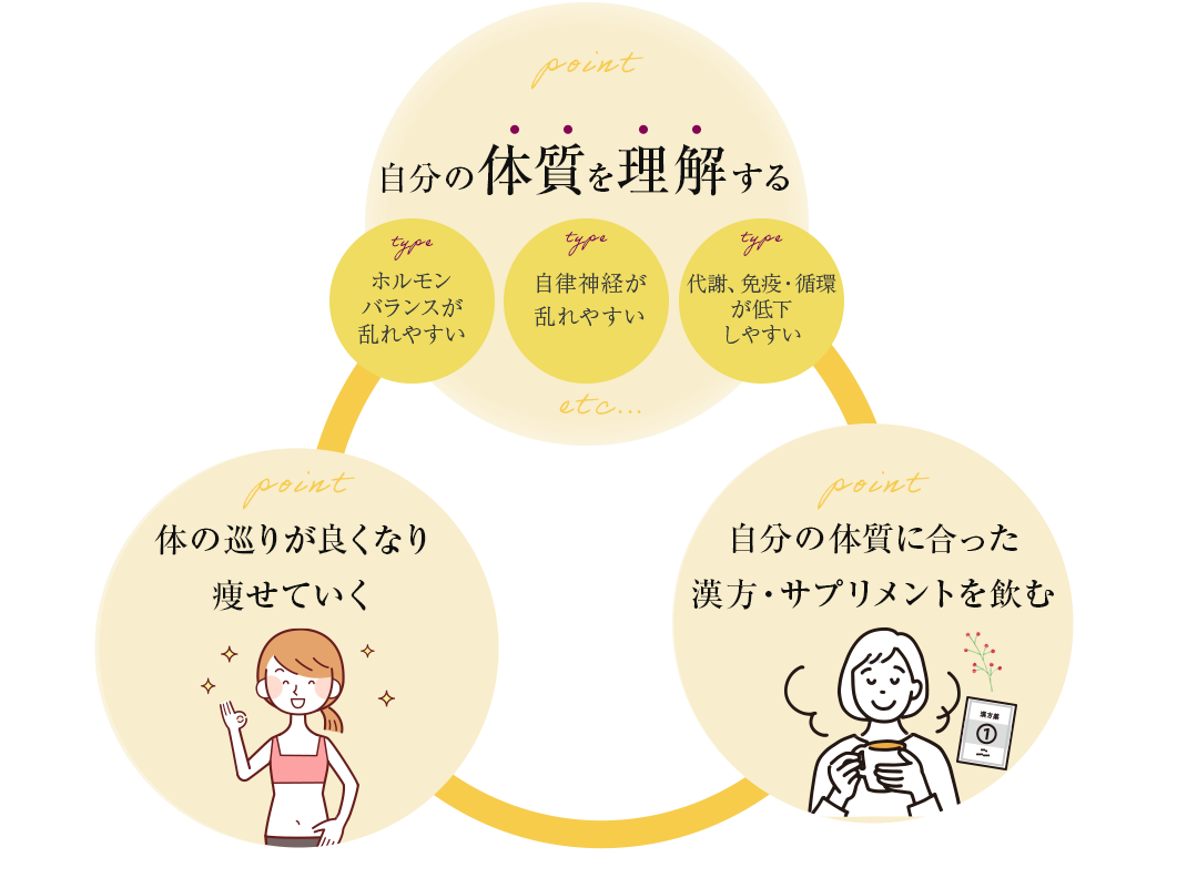 ダイエットで大切なのは、自分の体質を知ることです。体質によってご提案が異なるため、山川薬心堂では、まずはじめにあなたの体質を確認していきます。